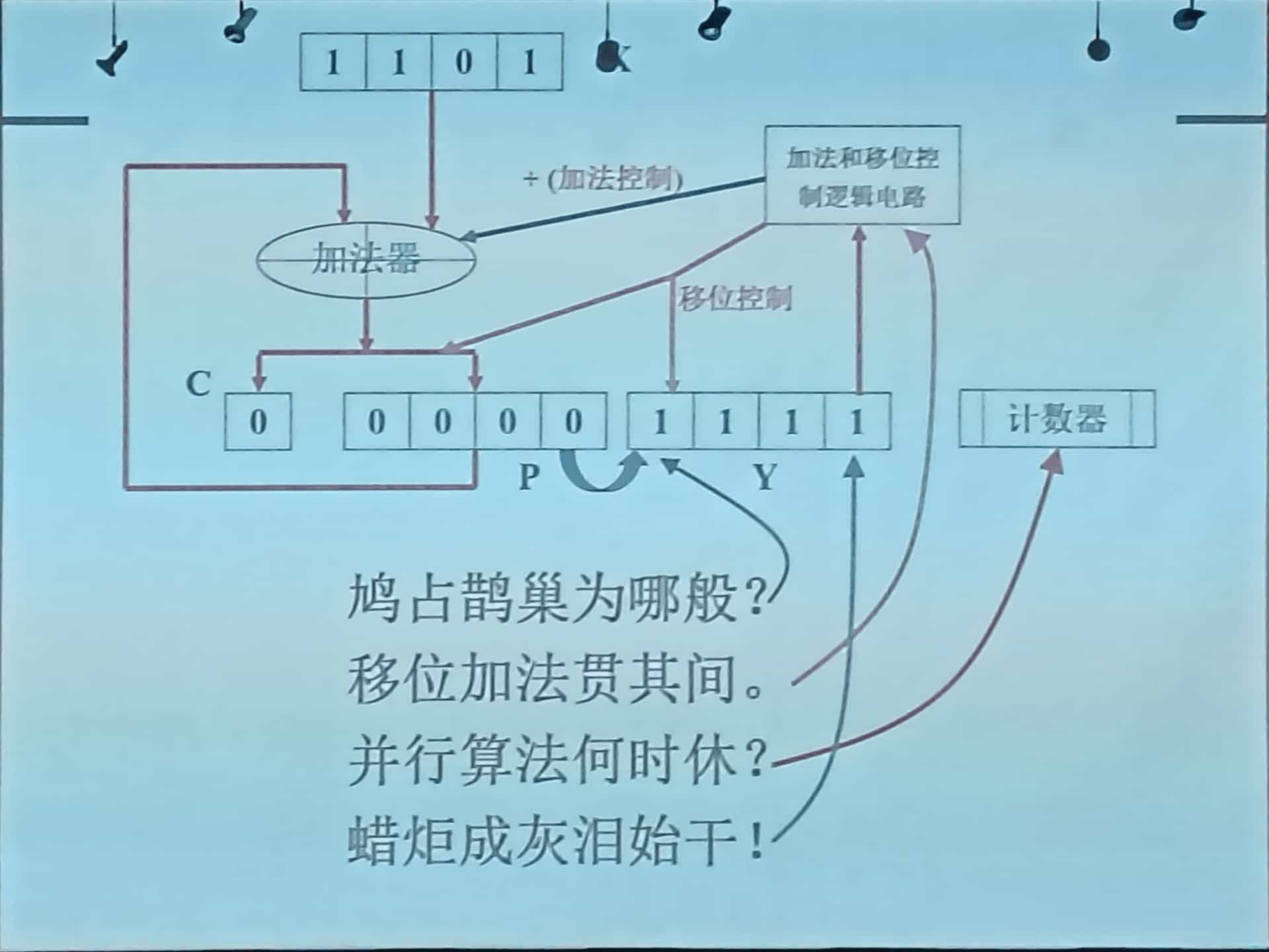 一周后整理的,全忘干净了,笔记也看不懂。只记得乘法器很有意思,没有一位的空间是浪费的,绝妙。