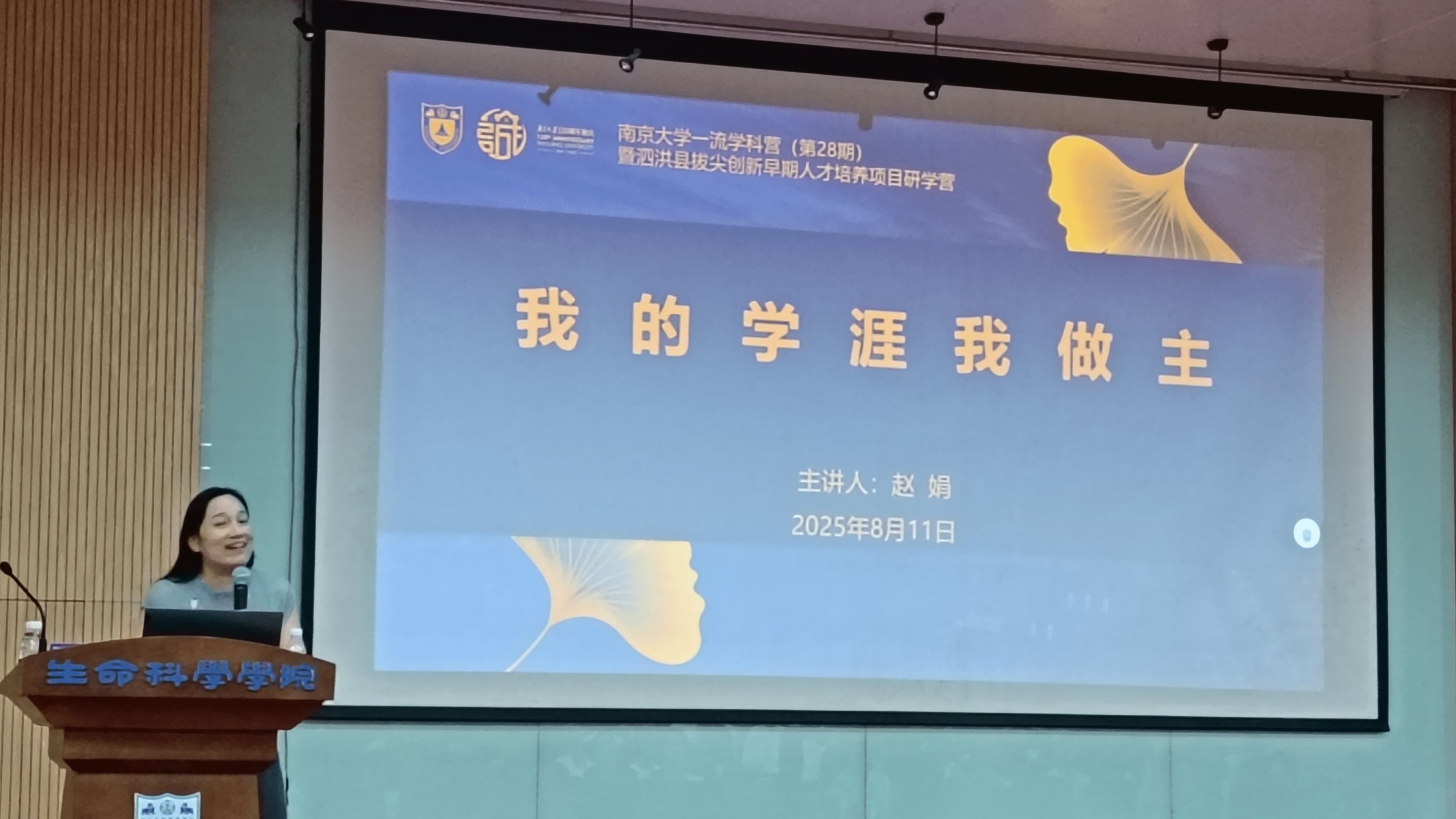 南京大学终身教育学院院长发言,介绍南京大学建设目标、终身教育学院发展历史和举办此类研学营的目的。