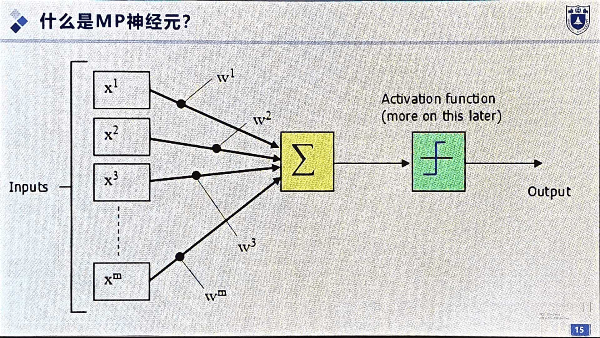 最开始的 MP 神经元人为指定权重 $w_i$,现在由训练学习得到。