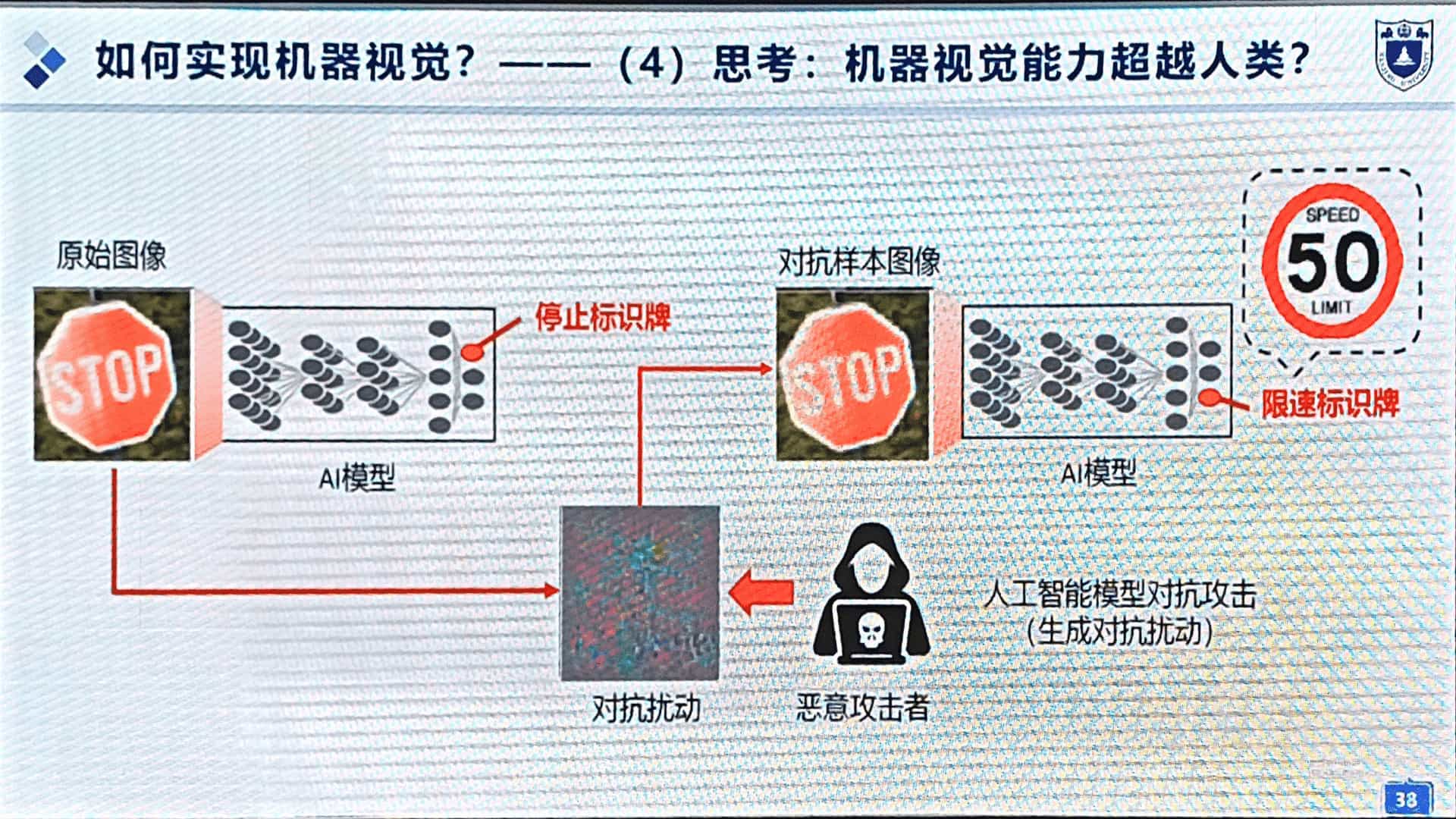 神经网络可以被攻击,产生相反的识别结果。攻击手段分电子、物理两类。(图18)